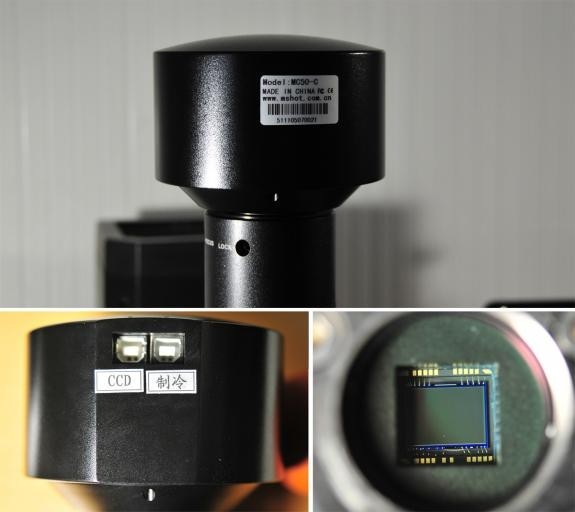 圖1,打開(kāi)包裝,第一眼看到實(shí)物,感覺(jué)異常眼熟--跟O家的DP71咋怎么像呢?大小分量都接近。不過(guò)看前面貼的標(biāo)簽,應(yīng)該是一款工程樣機(jī)(后跟Mshot工程師確認(rèn)了這一推測(cè)),后側(cè)由兩個(gè)特制USB 2.0接口,其中一根用來(lái)制冷。打開(kāi)下方的防塵,透過(guò)一層防塵玻璃,可清晰看到2/3英寸的CCD芯片。