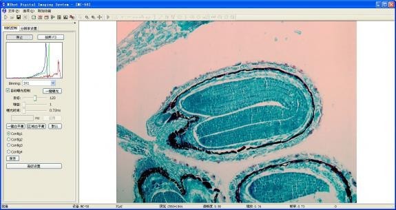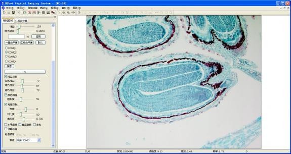 圖4 手動(dòng)模式下,目標(biāo)按鈕不可用,增益相當(dāng)于ISO感光度,范圍1-1023;曝光時(shí)間比較恐怖,0毫秒到17.9分鐘!一鍵白平衡需要把標(biāo)本移出視野,區(qū)域白平衡比較方便,選擇背景空白的地方做個(gè)選區(qū)即可。點(diǎn)開(kāi)高級(jí)控制,選項(xiàng)不少,增益控制其實(shí)應(yīng)該是手動(dòng)白平衡。默認(rèn)情況預(yù)覽框里看到的和目鏡內(nèi)看到的相反,習(xí)慣上,我還是勾選上水平翻轉(zhuǎn)和垂直翻轉(zhuǎn)—操作載物臺(tái)的習(xí)慣問(wèn)題。最下方是幀率選擇,默認(rèn)為Normal,還是High來(lái)的爽。再回到頂部,點(diǎn)擊分辨率設(shè)置可選預(yù)覽分辨率和照片分辨率,預(yù)覽時(shí)選1280×980可以兼顧分辨率和幀率。如此調(diào)整一番,可見(jiàn)白平衡比較準(zhǔn)確,色彩還原較真實(shí)。下面看圖像說(shuō)話。