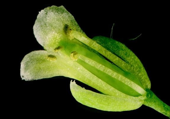 圖14 擬南芥花,4×,某突變體,故花瓣不是純白色,而是有點(diǎn)嫩黃色。整體表現(xiàn)比較到位,但是注意,右上側(cè)的兩根表皮毛顯出綠色,真實(shí)應(yīng)該是無(wú)色的。
