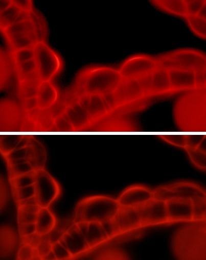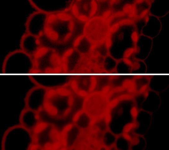 圖15 擬南芥花藥,40×,增益400,127 ms曝光,半薄切片,紅色熒光觀察,有壓縮。背景噪音基本被抑制,細(xì)胞壁成像清晰,色彩較真實(shí)。