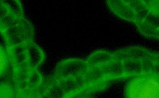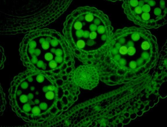 圖17 擬南芥花藥,40×,增益600,127 ms曝光,綠色通道觀察,有壓縮。由于綠色熒光較弱,且樹(shù)膠可見(jiàn)較強(qiáng)的自發(fā)熒光,故對(duì)冷CCD是個(gè)考驗(yàn),但整體成像尚可。