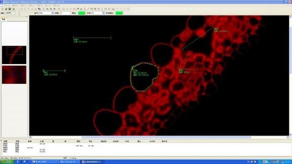 回過(guò)頭來(lái)再看軟件的其他功能。這一版本軟件圖像處理功能整合了常見(jiàn)的亮度/對(duì)比度,色相/飽和度,反相等等;另有一類圖像增強(qiáng)功能,說(shuō)明書內(nèi)沒(méi)有且少,是用來(lái)一下中值濾波功能,可以看到可以消除部分噪點(diǎn)(圖19)。軟件整合的測(cè)量功能比較齊全。長(zhǎng)度、圓面積、矩形、任意形狀、角度等,手繪測(cè)量面積時(shí),甚至可以手動(dòng)調(diào)整錨點(diǎn),以使測(cè)量更加精確(圖20);甚至在預(yù)覽狀態(tài)下也可以實(shí)現(xiàn)測(cè)量,這應(yīng)該是一個(gè)比較實(shí)用的功能。其它功能有計(jì)數(shù)、折射率、報(bào)表等不再一一贅述。